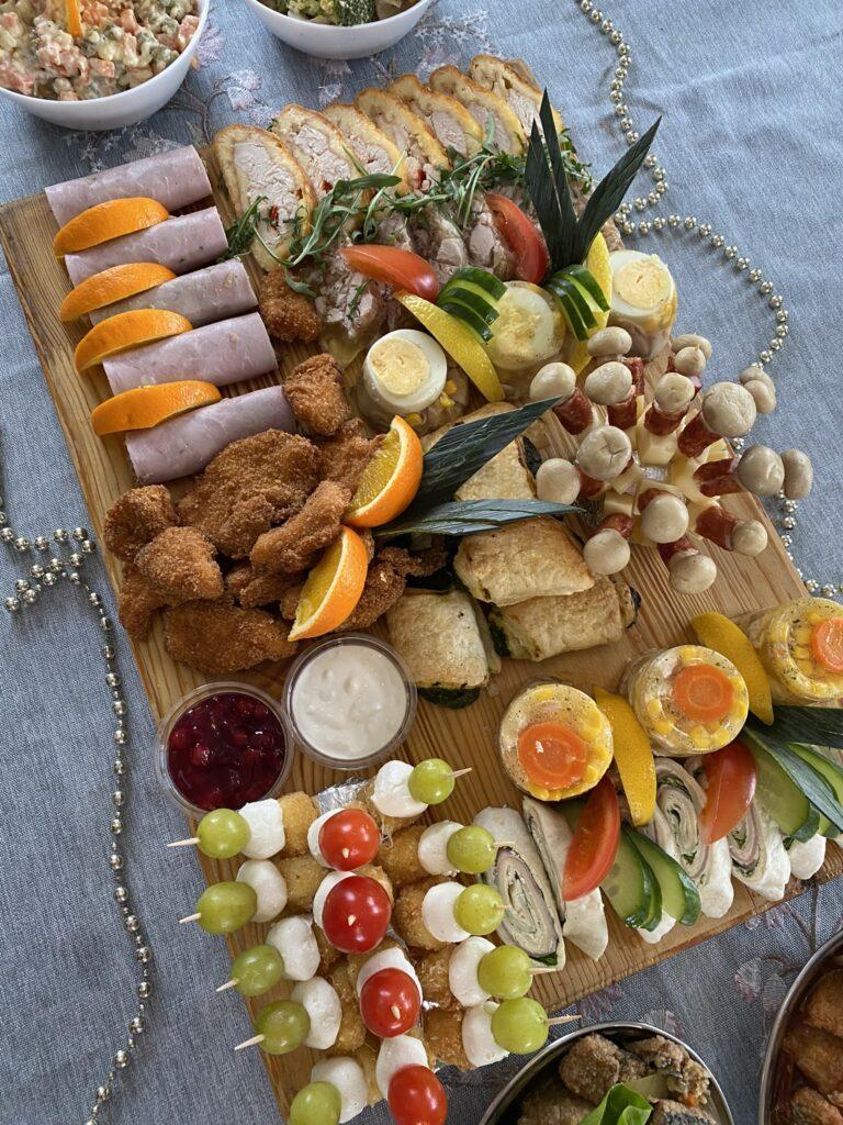 DESKA PRZEKĄSEK + 2 sałatki + 2 rodzaje ryb = 240 zł Zestaw na około 6 osób Idealne rozwiązanie dla każdego – pięknie różnorodnie i pysznie Dostawa Bieruń i okoliczne