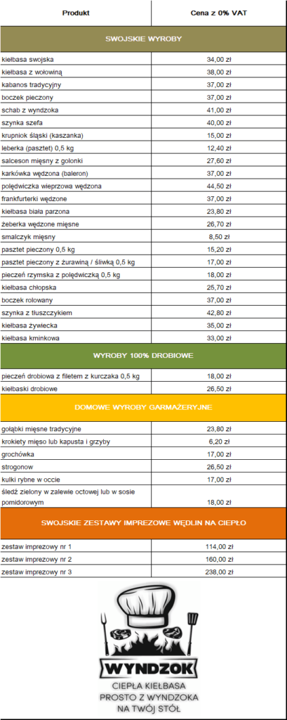 JEŚLI GRILL TO TYLKO Z WYNDZOKIEM! ⇒ TRADYCYJNA KIEŁBASA NA GRILLA 28ZŁ / KG ⇒ KARCZEK W MARYNACIE PLASTRY 33 ZŁ / KG ⇒ KRUPNIOK ZAWIJANY Z KAPUSTĄ KISZONĄ I CEBULKĄ 7 ZŁ